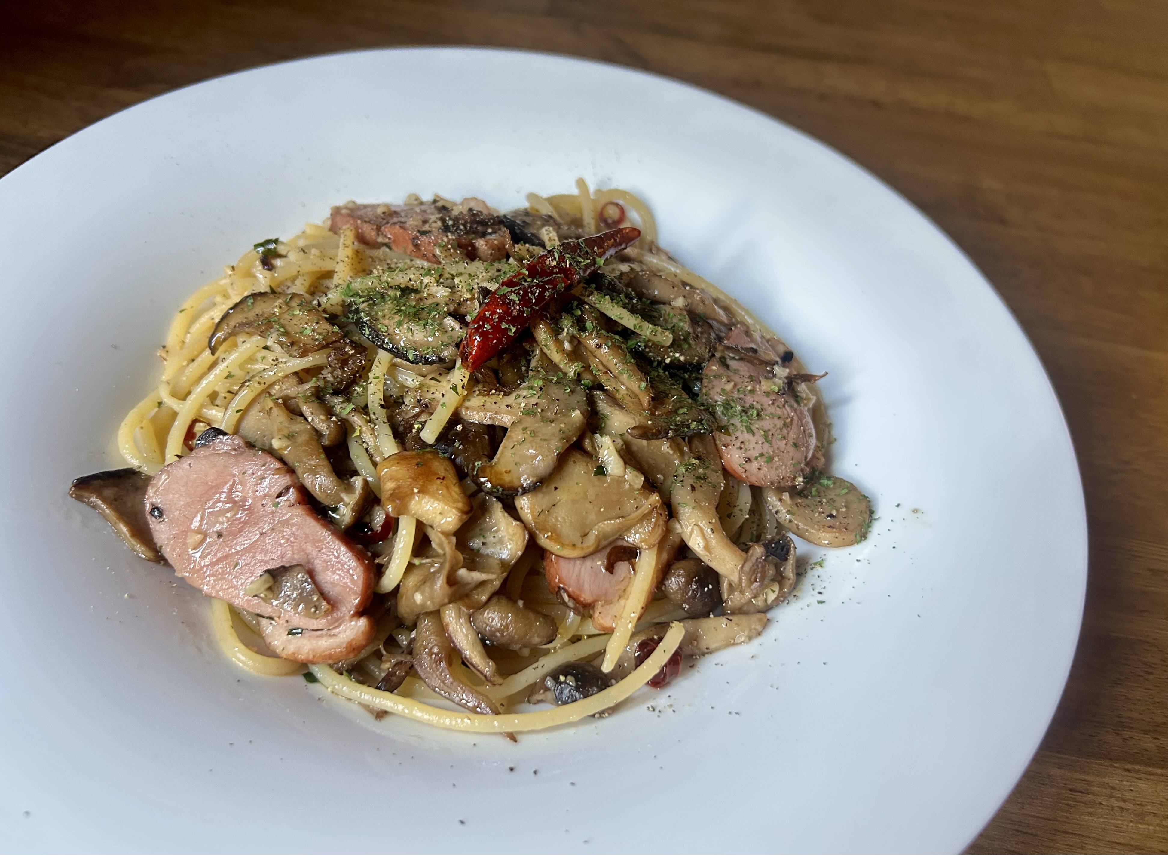 【合鴨のベーコンと4種きのこのペペロンチーノ】