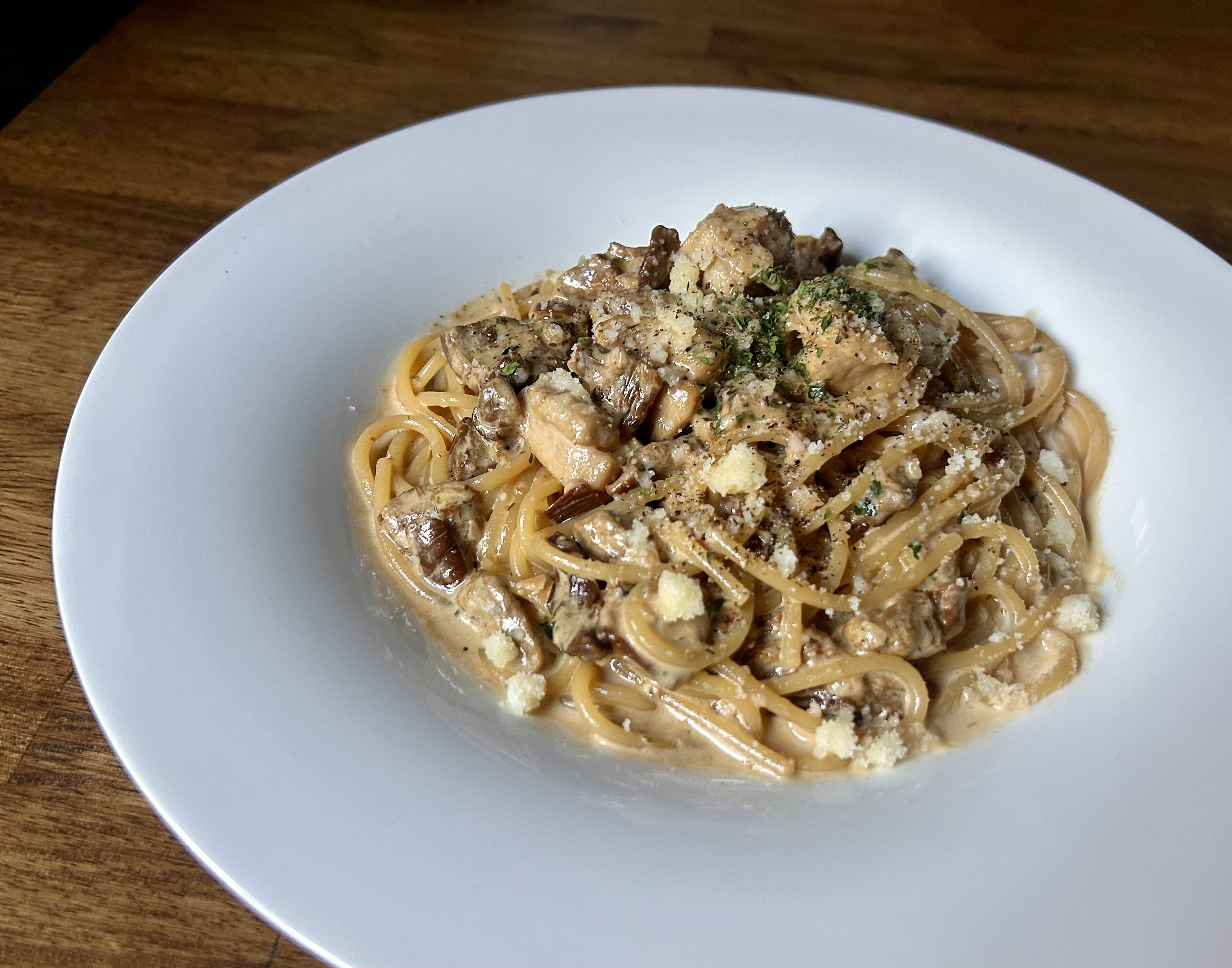 ローズマリーに漬け込んだ柔らかい美桜鶏と、たっぷりポルチーニのクリームパスタ。