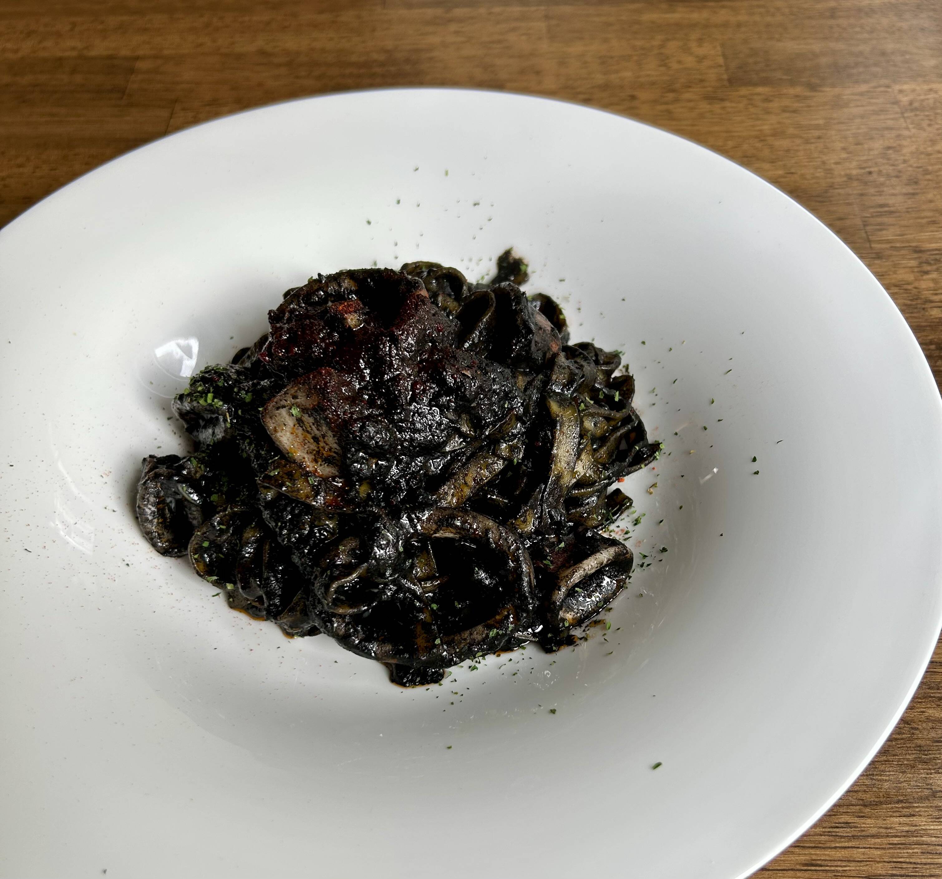 かぼちゃを練り込んだ生麺のタリアテッレに、イカスミのソースが絡み合う、ハロウィン限定のパスタです♪